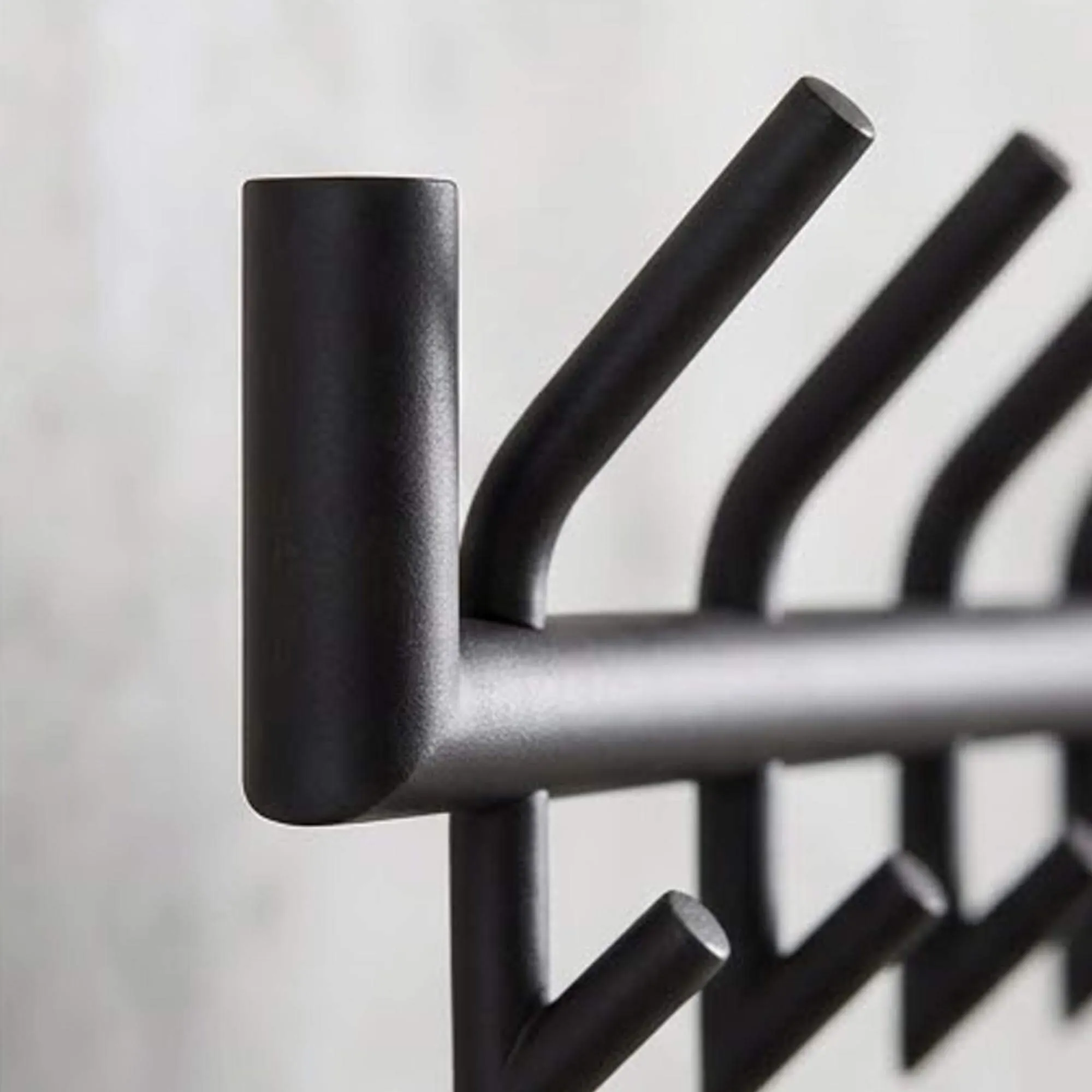 Vollständig aus Metall gefertigt, zeichnet sich die industrielle Wandgarderobe Nord durch die Qualität ihres Materials und eine tief schwarze Oberfläche mit leicht strukturierter Haptik aus. Diese Oberfläche fängt das Licht subtil ein und bringt die Nuancen des Metalls zur Geltung, ohne jemals zu glänzen. Unsere Designer haben die Formen der Haken mit großer Sorgfalt gestaltet: leicht geneigt bieten sie einen natürlichen Halt für Mäntel, Jacken oder Taschen und verhindern gleichzeitig das Abrutschen der Textilien. Das Gesamtbild ergibt eine ausgewogene Silhouette – grafisch und zugleich warm – ganz im Sinne des industriellen Stils, den wir gerne mit Raffinesse neu interpretieren.