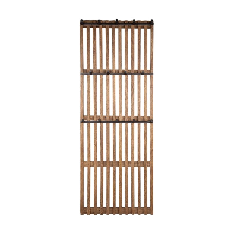 Gefertigt aus massivem Mangoholz, begeistert die wandmontierte Garderobe aus Holz Tweak durch die natürliche Wärme des Holzes und die Tiefe seiner Maserung, die bewusst sichtbar belassen wurde. Jede vertikale Leiste fängt das Licht auf unterschiedliche Weise ein und erzeugt ein feines Spiel aus Schatten und Nuancen, das sich im Laufe des Tages verändert. Das Holz wird mit schwarzen Metallhaken kombiniert, deren leicht strukturierte Oberfläche und matte Ausführung den Kontrast verstärken und den klaren, konstruierten Charakter des Designs unterstreichen. Dieser Dialog zwischen rohem Material und präzisen Linien macht den besonderen Reiz dieses Modells aus.