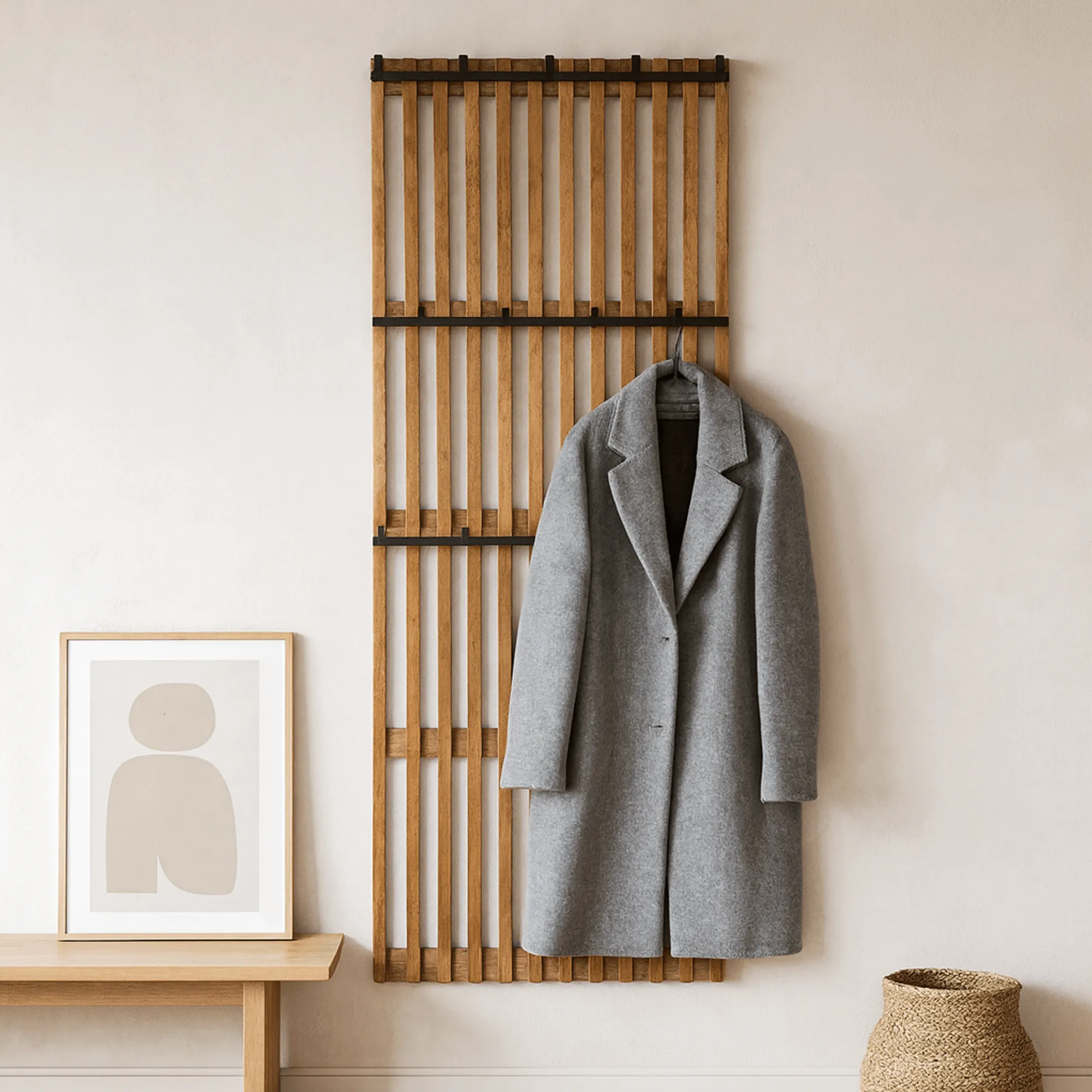 Mit seinen großzügigen Proportionen – etwa 160 cm Höhe und 60 cm Breite – fügt sich die wandmontierte Garderobe aus Holz Tweak ganz selbstverständlich in Eingangsbereiche, Flure oder auch Schlafzimmer ein, wo sie zudem eine akustische Funktion erfüllt, indem sie Schall absorbiert. Die geringe Tiefe von rund 10 cm ermöglicht eine elegante Installation selbst in schmaleren Räumen, während gleichzeitig ausreichend Platz für Mäntel, Jacken, Taschen oder Schals geboten wird. Die Haken sind auf mehreren Ebenen angeordnet und erleichtern so Organisation und täglichen Zugriff.