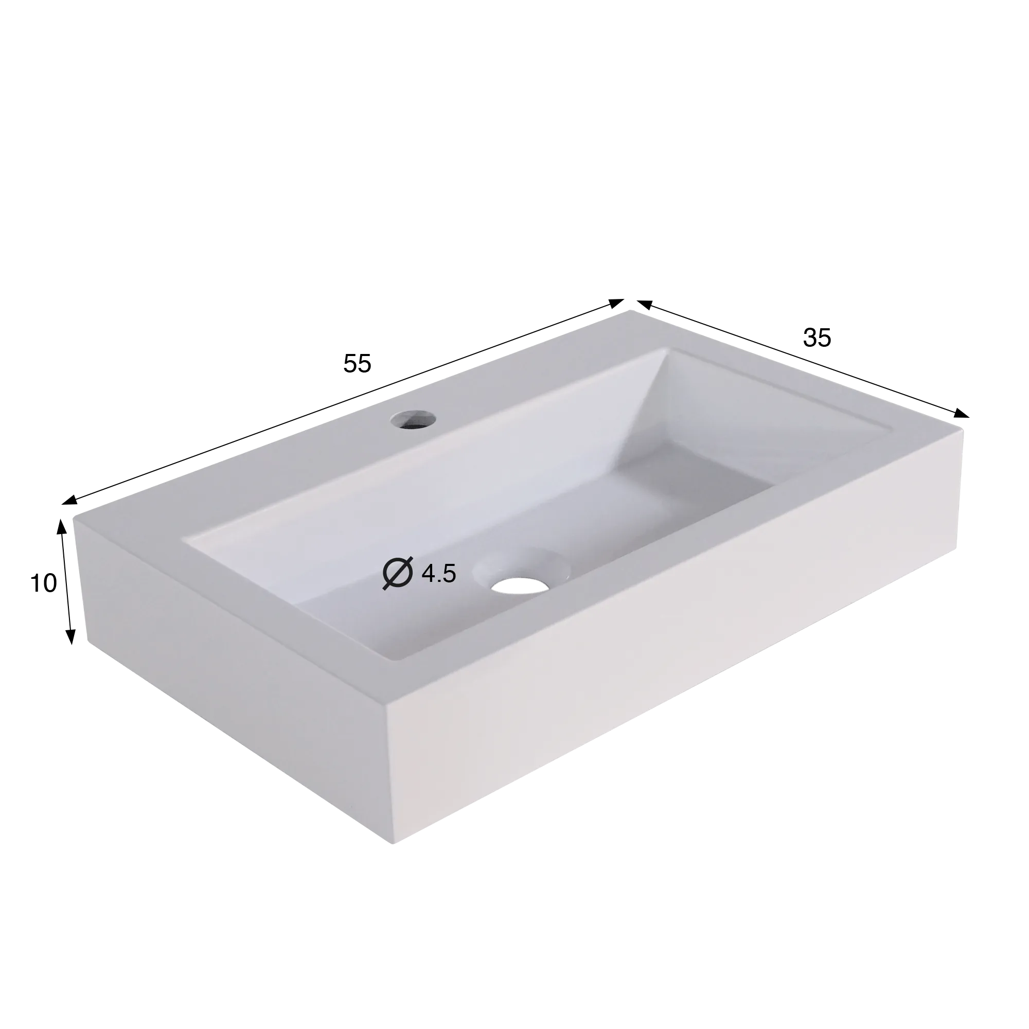 Mit großzügigen Maßen von 55 cm Breite, 35 cm Tiefe und einer Höhe von 10 cm bietet unser rechteckiges Aufsatzwaschbecken aus mattweißer Keramik, Odon, einen gut proportionierten Wasserbereich, der angenehm in der Nutzung ist, ohne das darunterliegende Möbel optisch zu dominieren. Die dezente Bohrung für die Armatur sowie die zentrale Ablauföffnung von 4,5 cm fügen sich selbstverständlich in das Design ein und bewahren die gestalterische Harmonie.