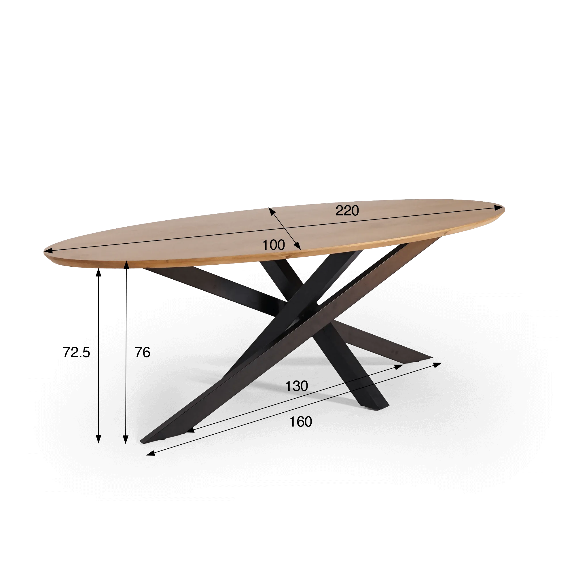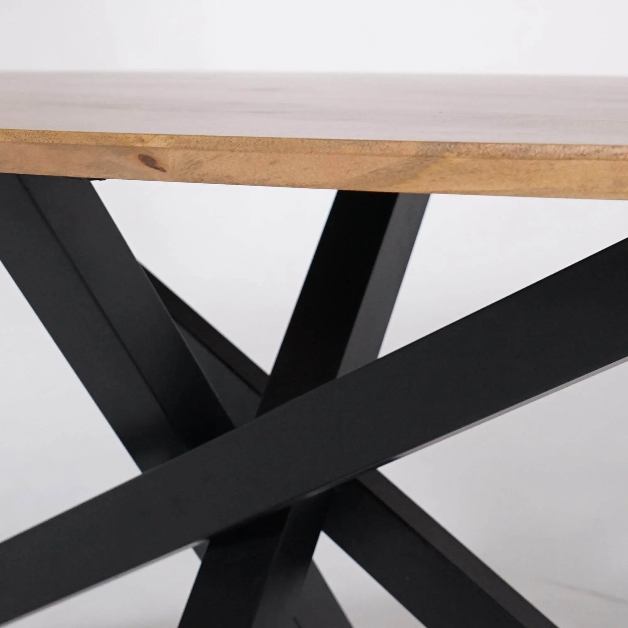 Unter der Platte dieses ovalen Esstisches aus Massivholz mit Mikado-Gestell aus Metall bildet das schwarze Metallgestell eine dynamische und markante Struktur. Die schräg verlaufenden Linien kreuzen sich präzise, sorgen für hohe Stabilität und lassen zugleich viel Beinfreiheit. Diese durchdachte Konstruktion ermöglicht ein bequemes Sitzen ohne Einschränkungen und erhöht den Nutzungskomfort im Alltag. Der Kontrast zwischen dem matten Metall und dem Massivholz erzeugt eine kontrollierte visuelle Spannung – typisch für einen zurückhaltend neu interpretierten Industriestil.