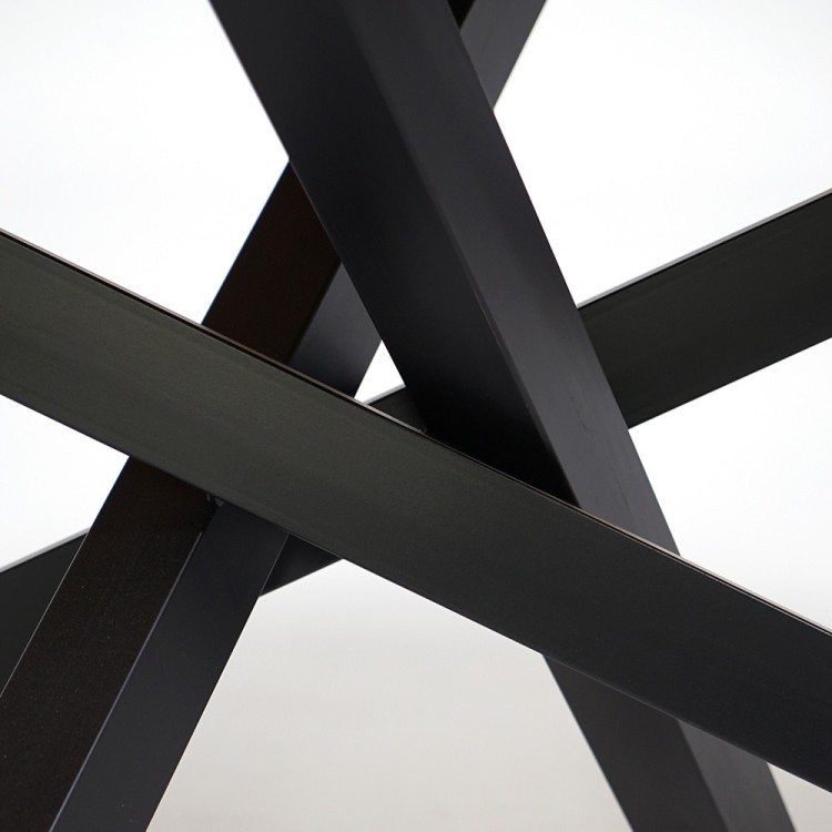 Die Beine dieses massiven Esstisches aus Holz mit Mikado-Gestell aus Metall und natürlichen Kanten lassen sich dank eines cleveren Systems mit unsichtbaren Schrauben und Muttern leicht montieren. Sie sind aus mattschwarzem Metall gefertigt und verleihen dem Tisch eine moderne Note. Das sorgfältig konzipierte Gestell sorgt für eine zeitgemäße Optik und einen subtilen Kontrast zur natürlichen Wärme des Holzes. Dieses originelle Design, inspiriert von den harmonischen Kreuzungen des Mikado-Spiels, garantiert sowohl Stabilität als auch Ästhetik. Jedes Detail wurde präzise durchdacht, um ein Möbelstück zu schaffen, das gleichermaßen robust wie elegant ist.