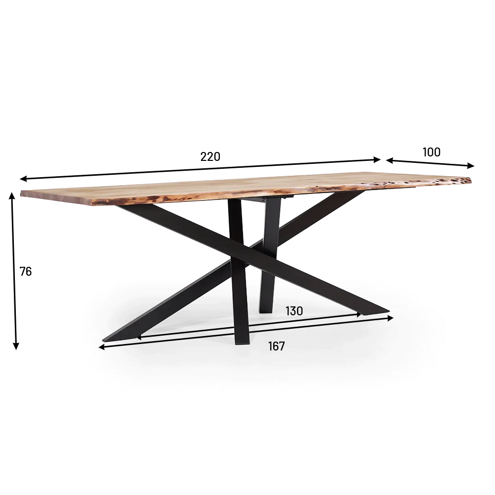Massivholz-Esstisch mit Metall-Mikadofuß und natürlichen Kanten 180 cm