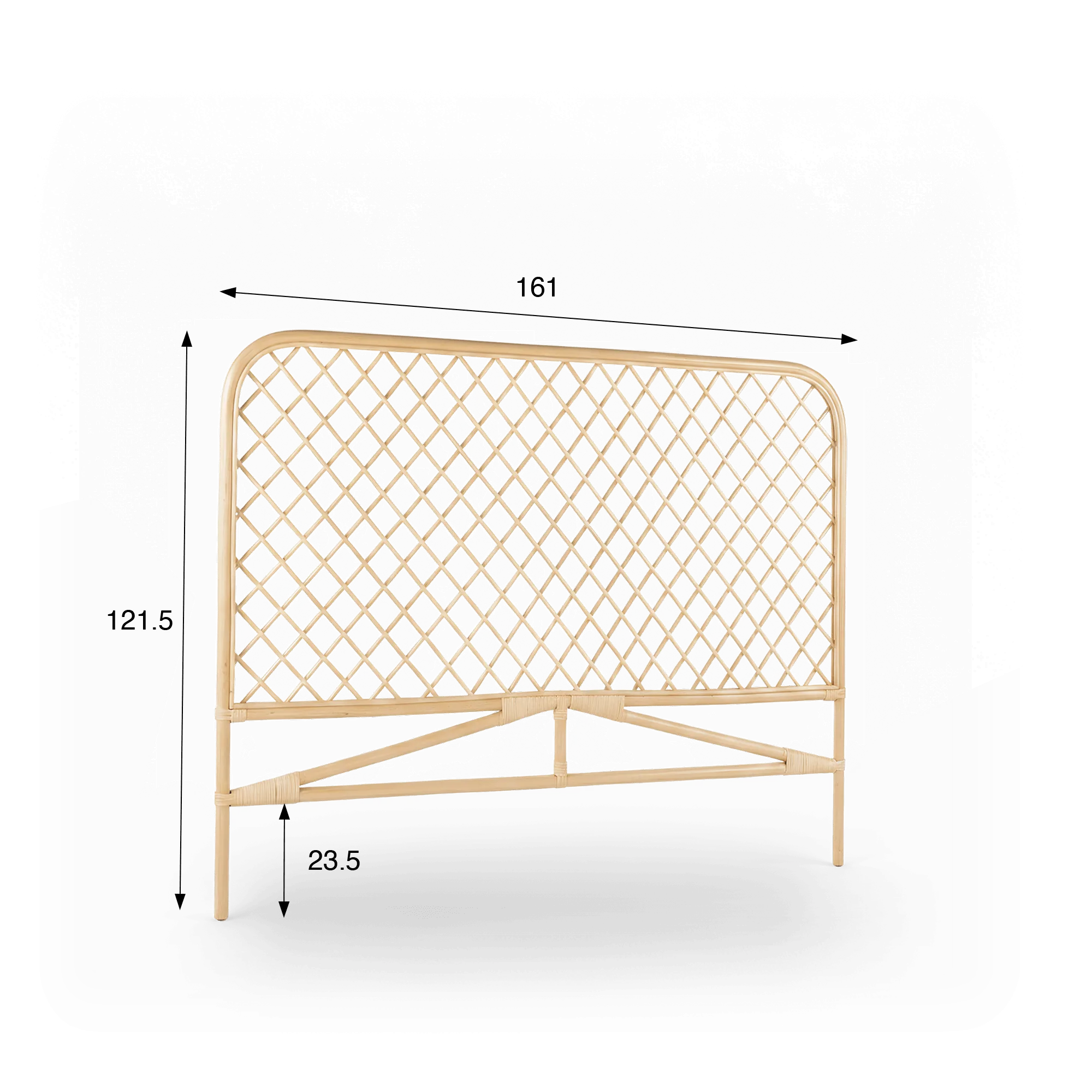 Mit einer Breite von 161 cm passt sich das 160 cm breite Kopfteil aus Rattan Rivia ideal an ein Bett mit 160 cm Breite an und bietet eine großzügige Präsenz, ohne den Raum zu dominieren. Die Gesamthöhe von 121,5 cm strukturiert die Wand hinter dem Bett und bleibt zugleich im Alltag komfortabel, insbesondere beim Anlehnen zum Lesen oder Entspannen. Die Füße, etwa 23,5 cm vom Boden abgehoben, erleichtern die Kombination mit verschiedenen Lattenrosten und tragen zum Eindruck visueller Leichtigkeit bei.