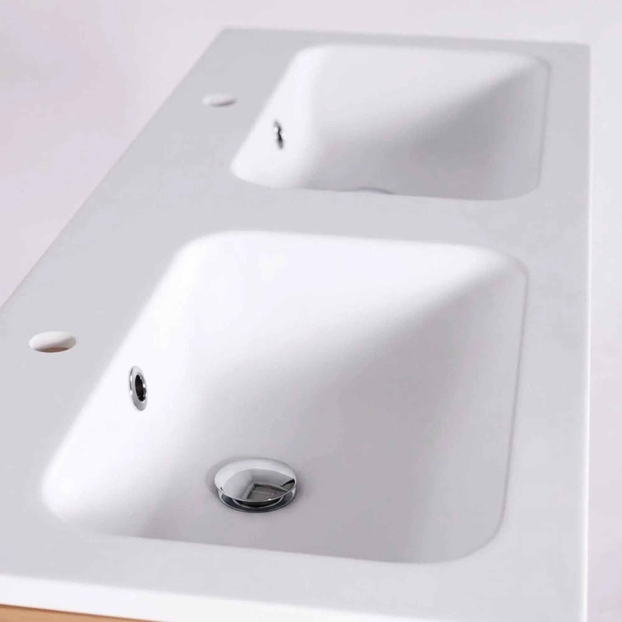 Wir haben dieses doppelte Badezimmermöbel aus Massivholz in matt Weiß als stimmiges Gesamtbild konzipiert, das den Raum strukturiert, ohne ihn zu fixieren. Das massive Mindi-Holz, ausgewählt aufgrund seiner Stabilität und seiner sanften Ausstrahlung, zeigt einen warmen Farbton mit feiner Maserung. Seine seidige Haptik, von unseren Handwerkern sorgfältig ausgearbeitet, bildet einen eleganten Kontrast zur matt weißen Oberfläche der Keramikplatte, die das Licht reflektiert und das Gefühl von Helligkeit verstärkt. Dieses Zusammenspiel aus natürlichem Material und mineralischer Oberfläche verleiht dem Möbel eine ruhige Silhouette, die sich sowohl in ein reduziertes Interieur als auch in ein ausdrucksstärkeres Bad integrieren lässt.