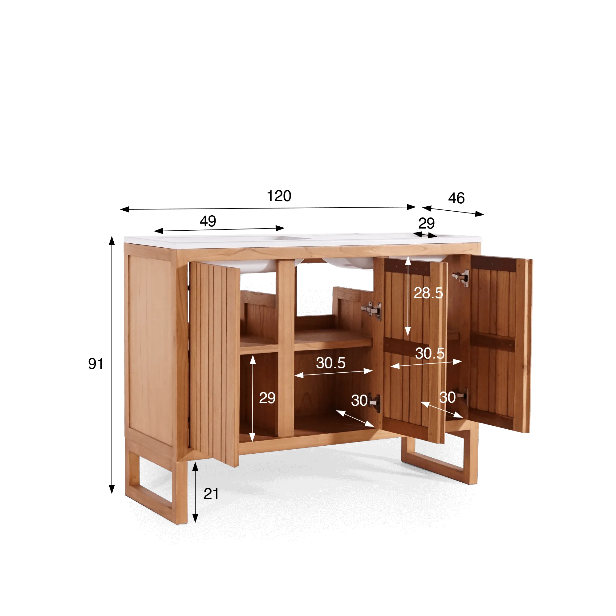 Mit einer großzügigen Breite von 120 cm und einer Höhe von etwa 91 cm bietet der doppelte Waschtischunterschrank aus Massivholz, matt weiß, Satya einen hohen Nutzungskomfort im Alltag. Hinter den drei Drehtüren verbergen sich gut proportionierte Stauraumfächer, die Platz für Wäsche, Pflegeprodukte und Accessoires bieten, ohne das Gesamtbild zu überladen. Innen erleichtern 30,5 cm breite Fächer die Organisation, während die verfügbare Höhe unter den Waschtischen eine freie Führung der Sanitäranschlüsse ermöglicht. Die leicht erhöhten Holzfüße verleihen dem Möbel Leichtigkeit und erleichtern zugleich die Bodenpflege.