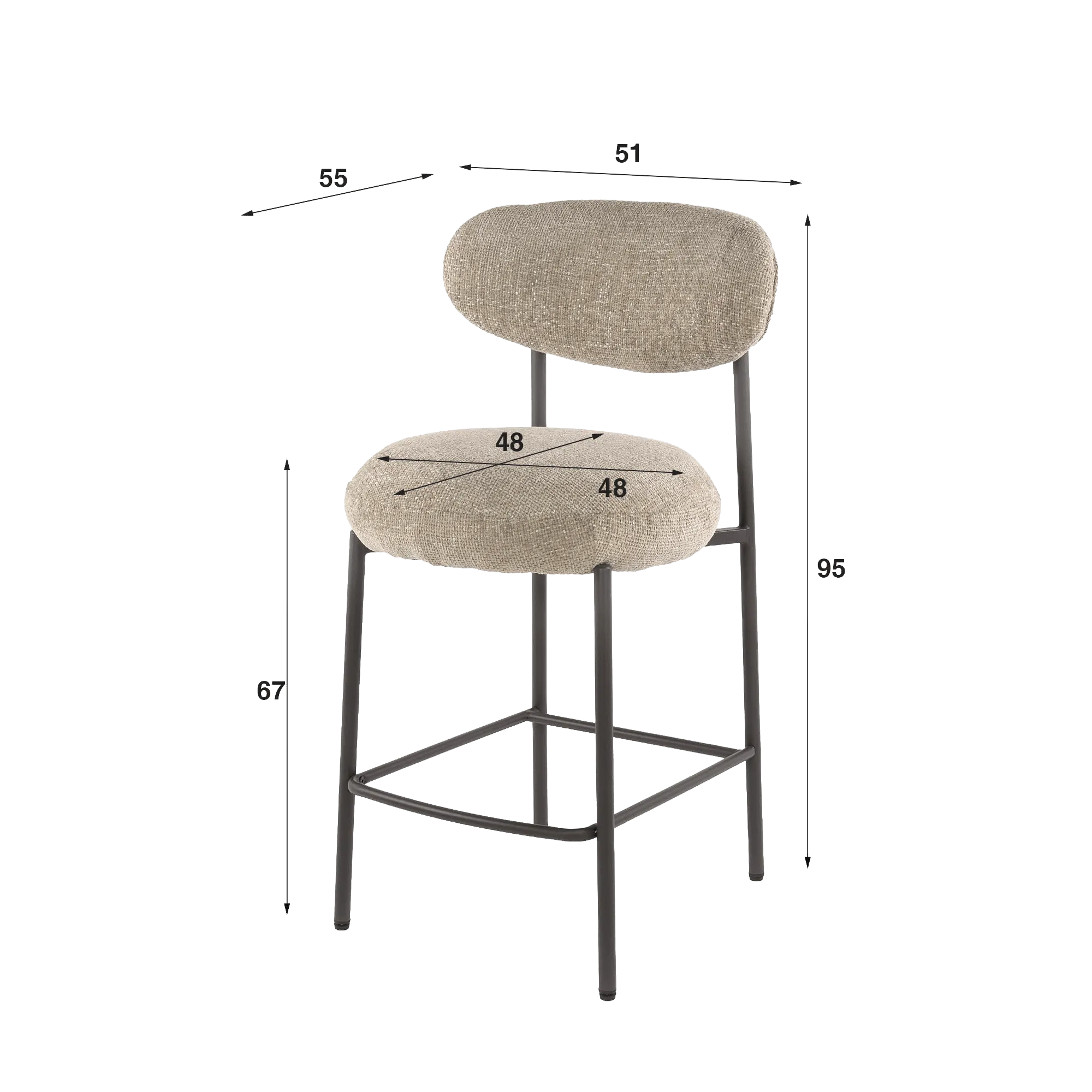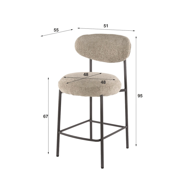 Das Metallgestell dieses Küchenbarstuhls für Kücheninsel, schlank und klar strukturiert, setzt einen kontrollierten Kontrast zur weichen Polsterung. Wir haben die Proportionen so ausgearbeitet, dass eine hervorragende Stabilität gewährleistet ist, ohne die optische Leichtigkeit zu verlieren. Die integrierte Fußstütze, in komfortabler Höhe positioniert, unterstützt die Ergonomie und lädt zu einer natürlichen Sitzhaltung ein. Mit einer Sitzhöhe von etwa 67 cm passt der Küchenbarstuhl für Kücheninsel Kai ideal zu gängigen Kücheninseln und Arbeitsplatten, während eine Sitzbreite von 48 cm ein umhüllendes Sitzgefühl bietet, ohne den Raum zu überladen.