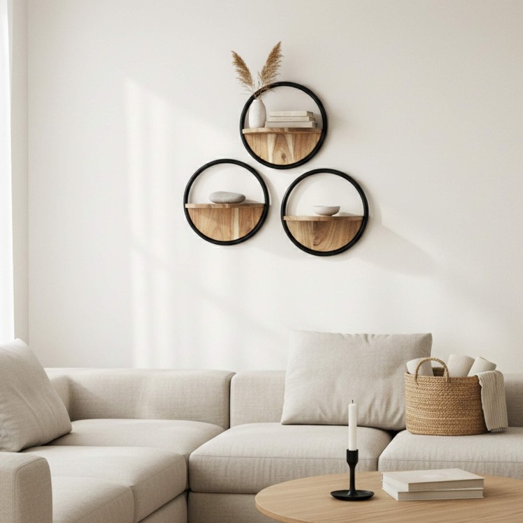 Als vollwertiges dekoratives Element gedacht, interpretiert das runde industrielle Wandregal mit Holzablage im 3er-Set Urban den Industrie-Look neu – mit einer weicheren, zeitgemäßen Note. Dieses Set aus drei runden industriellen Wandregalen haben wir als Komposition entworfen, die eine Wand gestaltet und dabei funktional bleibt. Mit einem Durchmesser von etwa 35 cm und einer Tiefe von rund 17 cm bieten sie problemlos Platz für Bücher, Deko-Objekte oder kleine Pflanzen, ohne an der Wand schwer zu wirken – die Silhouette bleibt bewusst leicht.