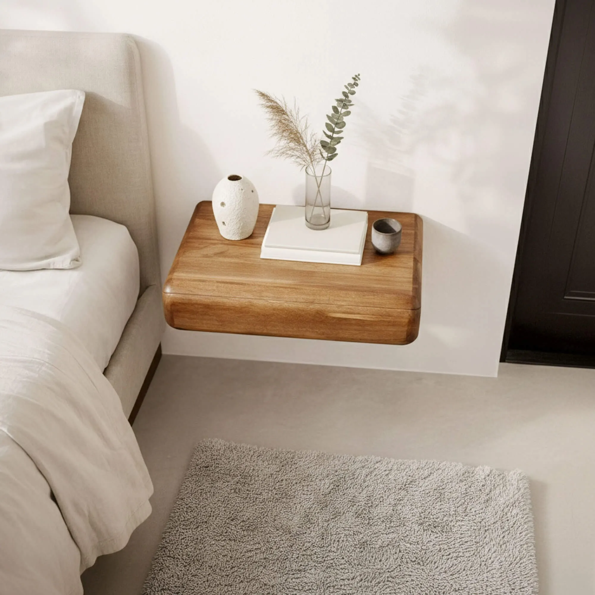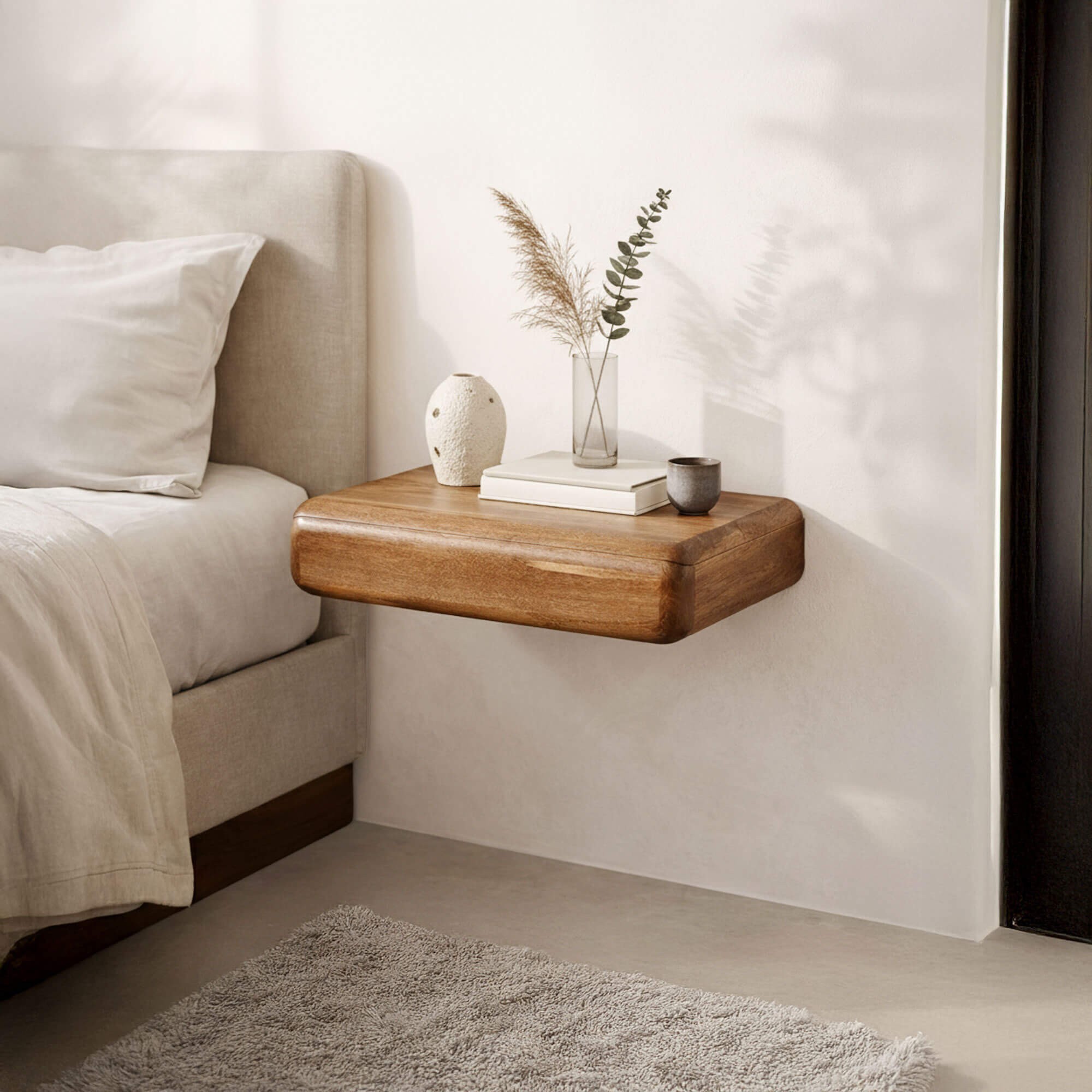 Bereits montiert geliefert, vereinfacht der hängende Nachttisch aus Massivholz mit Schublade Elia die Installation und ermöglicht eine schnelle Anbringung. Wir wollten ein Möbelstück, das sich leicht in den Alltag integriert — sowohl in ein minimalistisches Schlafzimmer als auch in ein wärmeres Ambiente mit Naturtextilien, Rattan oder Leinen.