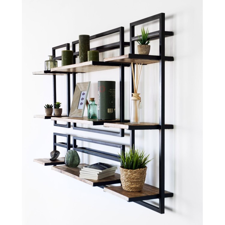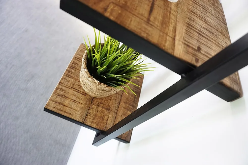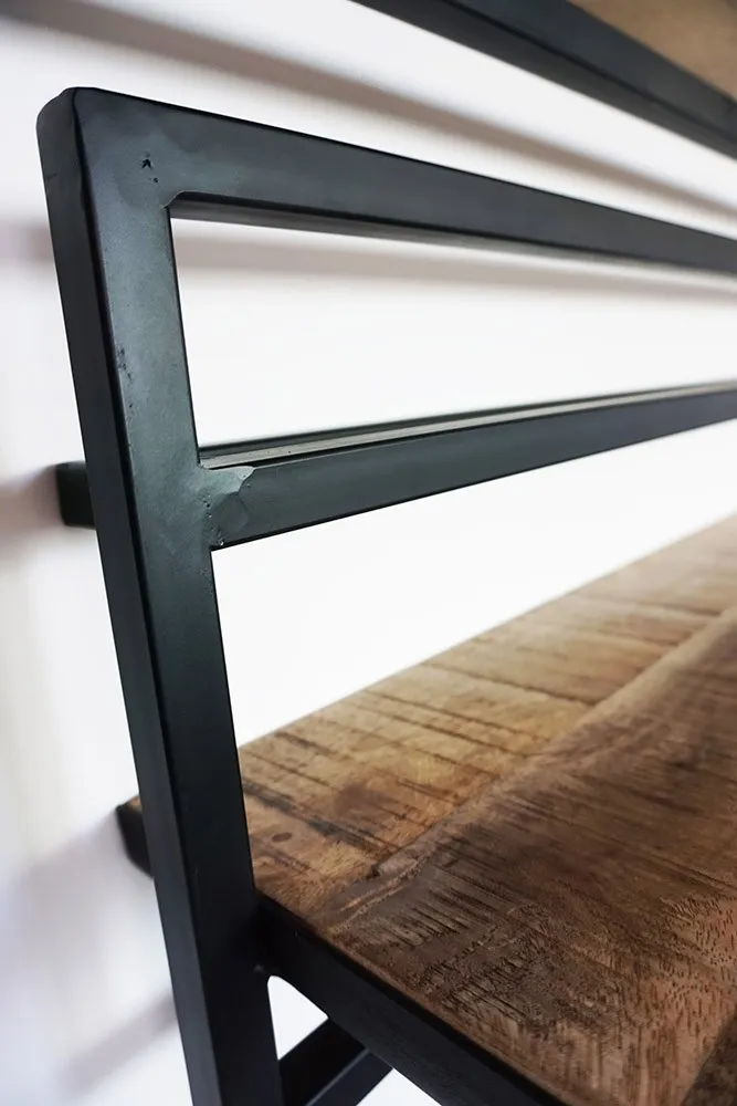 Die Regalböden aus Massivholz sind auf einem wunderschönen Metallrahmen montiert. Das lineare Aussehen dieser Verbindung verstärkt den industriellen Look und verleiht dem Ganzen Leichtigkeit. Der Rahmen ist aus schwarzem Metall gefertigt und mit Wandbefestigungen versehen, damit Sie die Regale bequem aufhängen können. Schrauben und Dübel zur Befestigung sind nicht im Lieferumfang enthalten. Seien Sie also vorausschauend, damit Sie sich so schnell wie möglich an Ihrer neuen, zur Wand passenden Dekoration erfreuen können.
