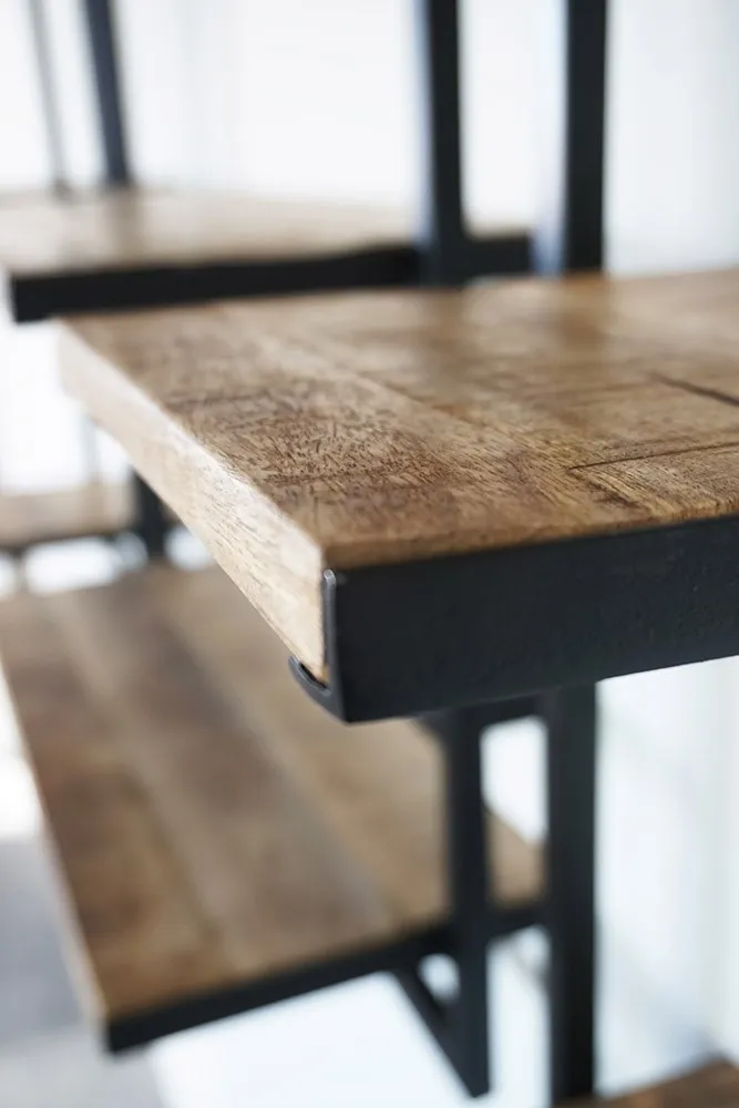 Wir schätzen den Materialmix aus Holz und Metall. Auf der einen Seite das Mangoholz mit seinem rohen Aussehen und auf der anderen Seite der solide Stahl, der eine industrielle Note hinzufügt. Robuste Materialien, die die Zeit überdauern werden, ohne einen Faltenwurf zu bekommen.