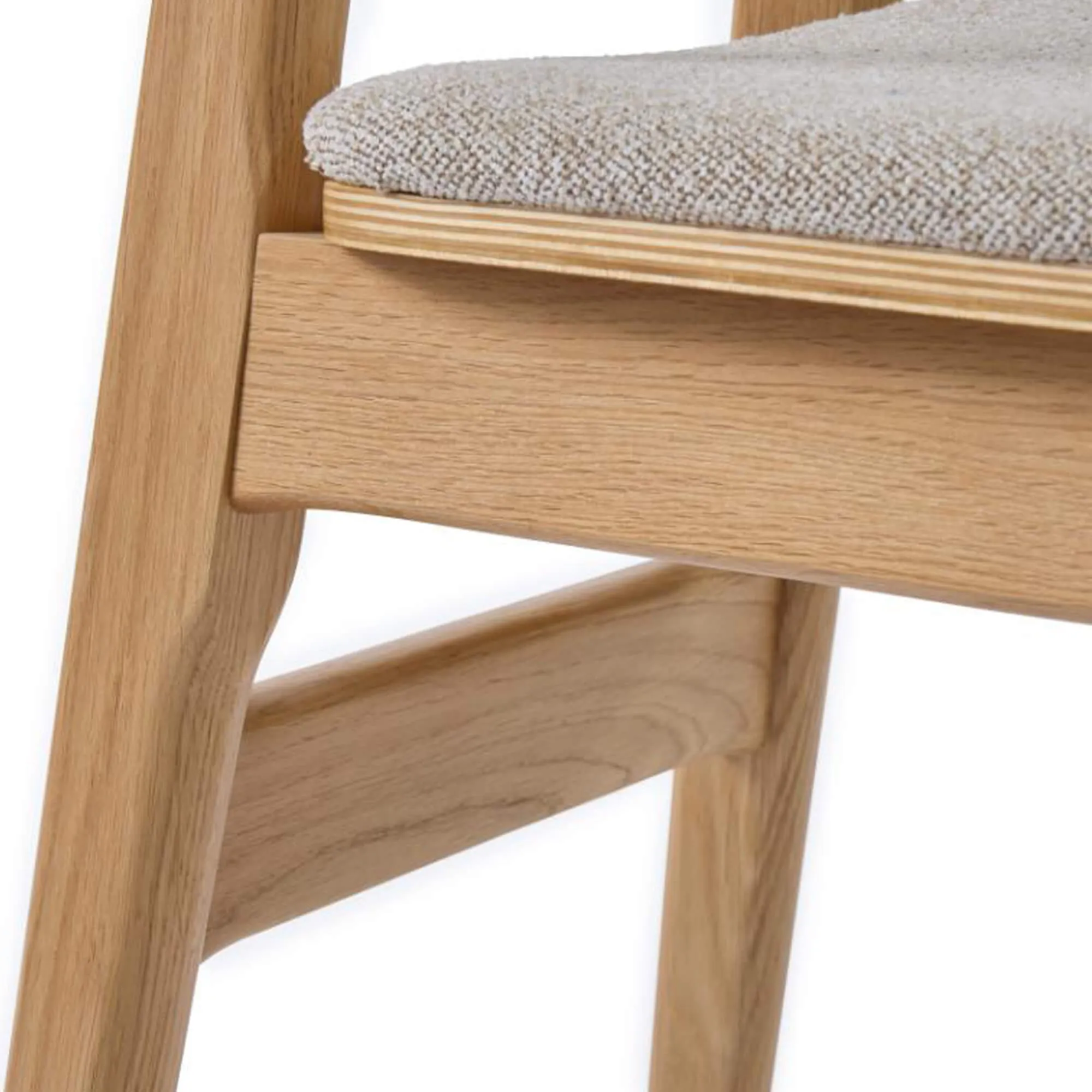 Wir haben uns für Eiche entschieden – wegen ihrer Robustheit und der Schönheit ihrer Maserung, die im Licht warme und authentische Nuancen offenbart. Jedes Detail des Esszimmerstuhls Lima aus naturfarbener Eiche und grauem Stoff wurde sorgfältig durchdacht, von der Weichheit der gerundeten Kanten bis zur feinen Ausführung der sichtbaren Verbindungen auf der Rückseite der Konstruktion. Dieser handwerkliche Ansatz ermöglicht es uns, ein langlebiges Möbelstück anzubieten, das dafür gedacht ist, die Zeit zu überdauern und dabei seinen natürlichen Charme zu bewahren.