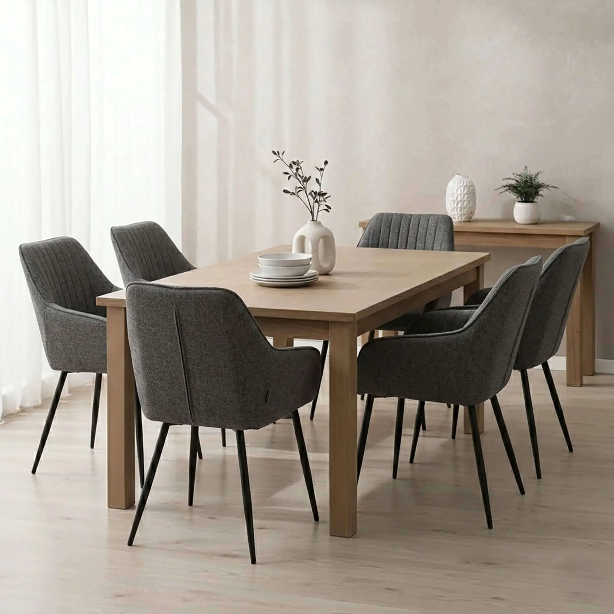 In einem hellen Raum, einem zeitgenössischen Interieur oder einem eher minimalistischen Ambiente bringt der Esszimmerstuhl Nolan Stripe aus anthrazitfarbenem Stoff eine moderne und einladende Note. In Kombination mit unseren Tischen aus Massivholz trägt er zu einem harmonischen Ensemble bei, in dem Materialien und Linien ganz natürlich miteinander in Dialog treten und so einen ausgewogenen Wohnbereich schaffen.