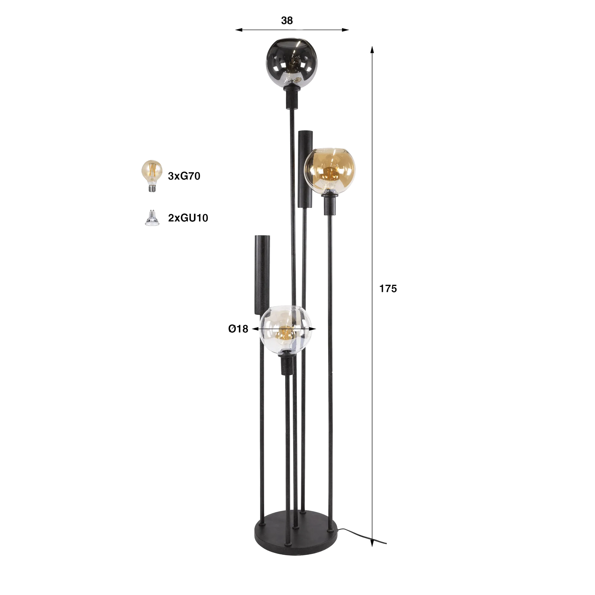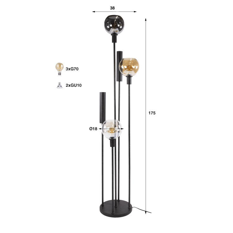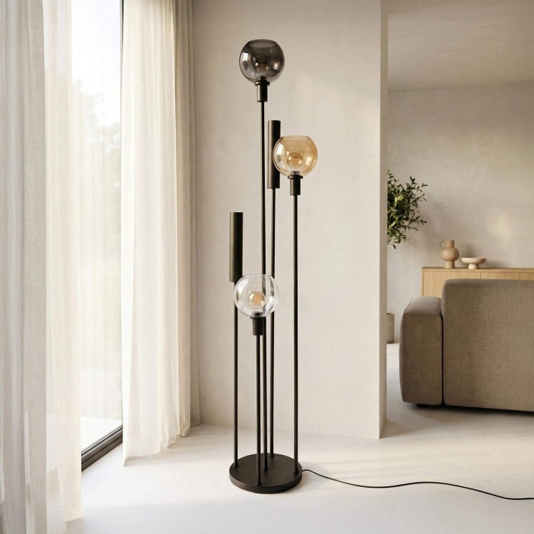 Die kugelförmigen Schirme aus mundgeblasenem Glas dieser Wohnzimmer-Stehlampe aus schwarzem Metall mit einem Durchmesser von etwa 18 cm verbreiten ein sanftes und umhüllendes Licht. Der Kontrast zwischen den leicht getönten, bernsteinfarbenen und transparenten Oberflächen schafft eine warme visuelle Tiefe, ideal, um am Ende des Tages eine gedämpfte Atmosphäre entstehen zu lassen. Besonderes Augenmerk haben wir auf die bewusst leicht gekörnte Struktur des schwarzen Metalls gelegt, um die industrielle Inspiration zu unterstreichen und gleichzeitig eine zeitgemäße Note zu bewahren.
