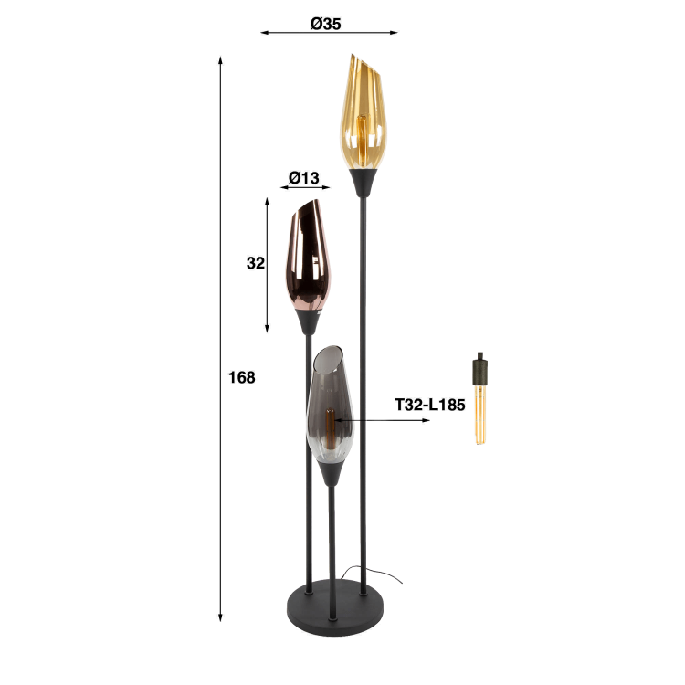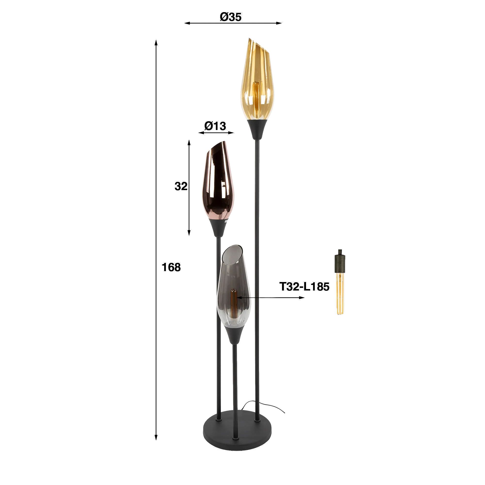 Die feine und ausgewogene Struktur aus schwarzem Metall dieser Designer-Stehlampe mit Lampenschirmen aus bernsteinfarbenem Glas erhebt sich aus einem stabilen runden Sockel, dessen Proportionen für einen sicheren Stand sorgen. Wir haben die Metalloberfläche so bearbeitet, dass eine leicht strukturierte Haptik entsteht, die den authentischen Charakter des Ganzen unterstreicht und zugleich die Klarheit ihrer Linien betont. Die drei Lampenschirme aus mundgeblasenem Glas (Leuchtmittel [T32-L185] nicht im Lieferumfang enthalten) zeigen jeweils eine zart rauchige oder bernsteinfarbene Nuance und erinnern an die Wärme eines gedämpften Lichts am Ende des Tages. Ihre schlanke, subtil verjüngte Form dieser Designer-Stehlampe aus schwarzem Metall mit Lampenschirmen aus bernsteinfarbenem Glas verbreitet ein sanftes Licht, das eine einladende Atmosphäre schafft, ohne zu blenden.