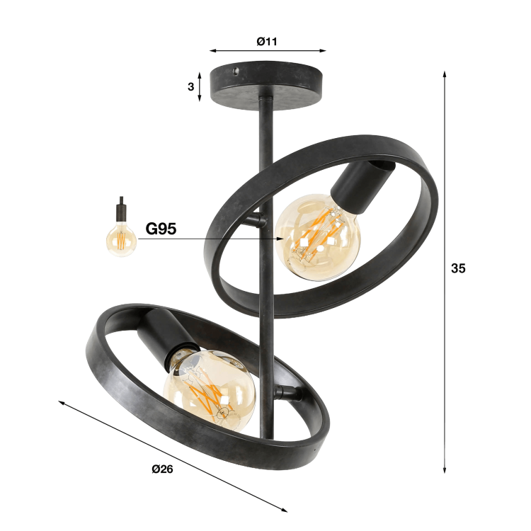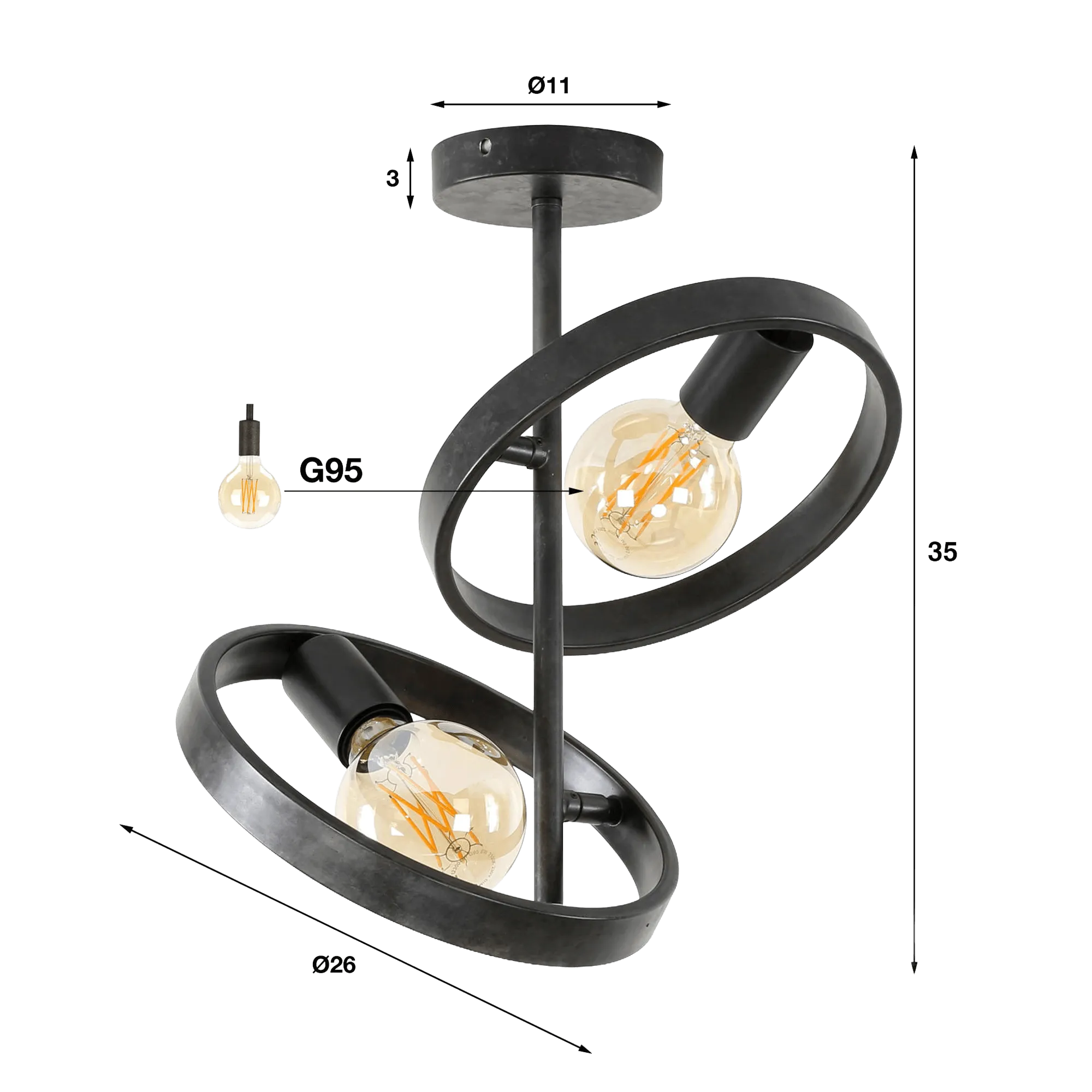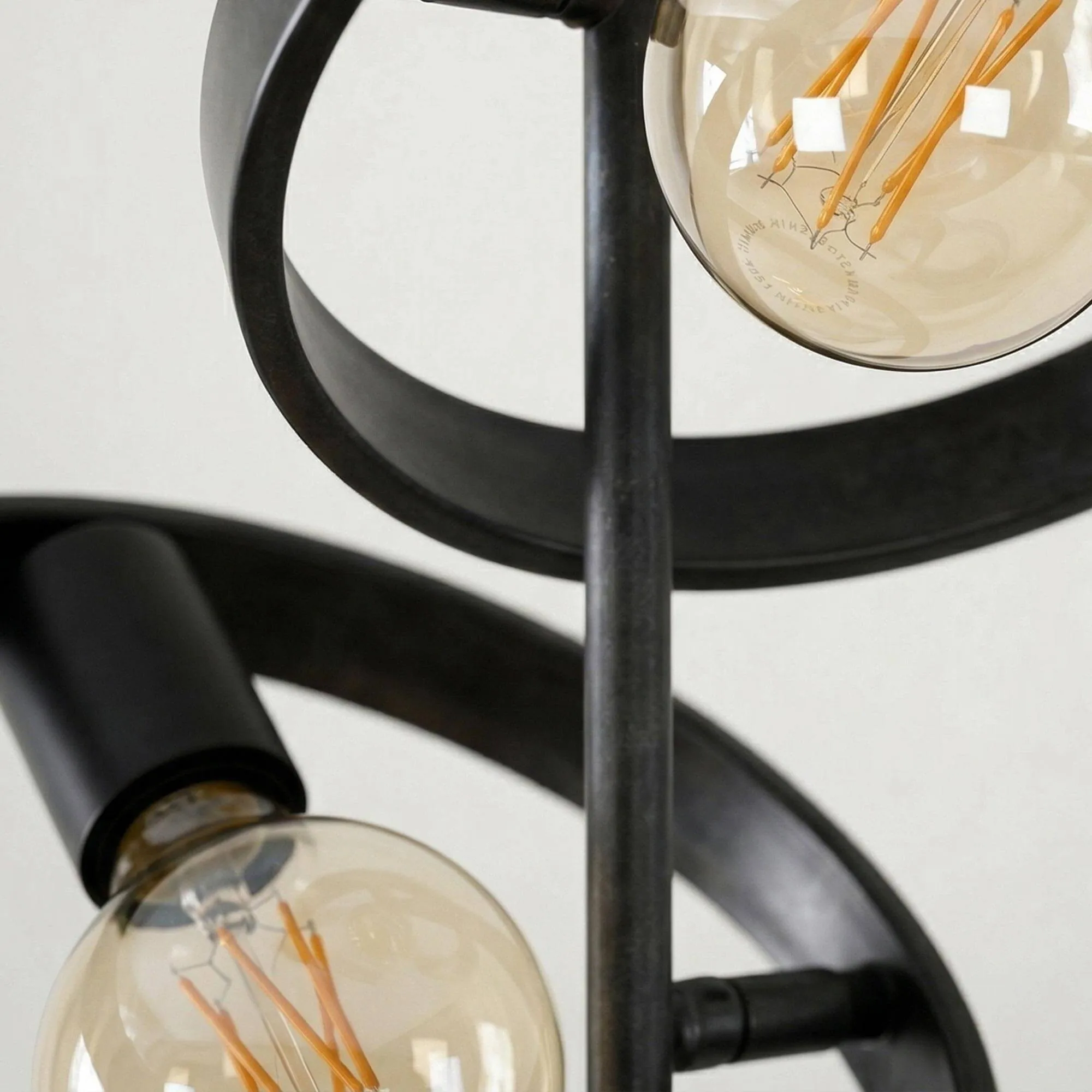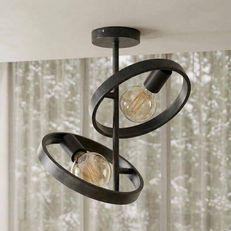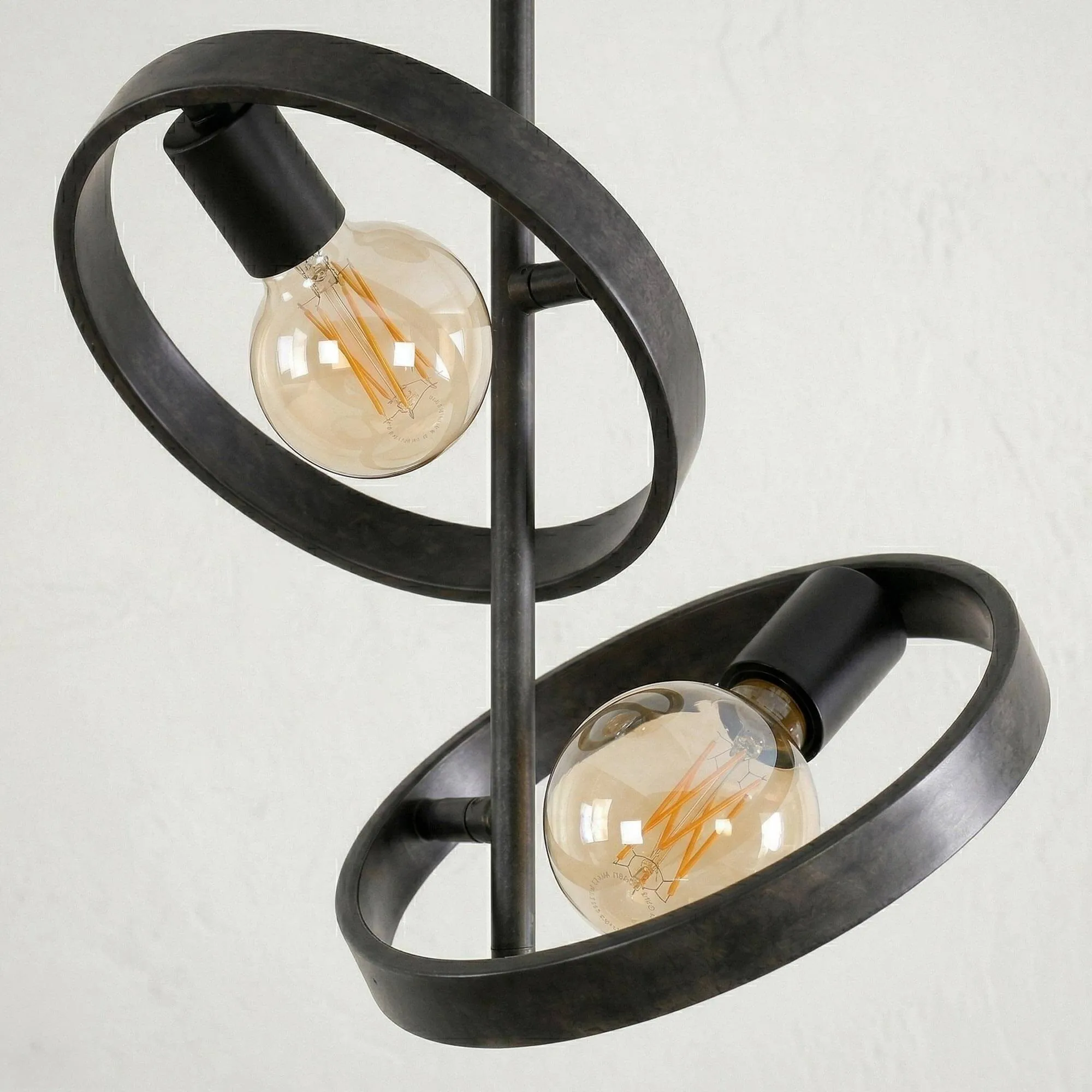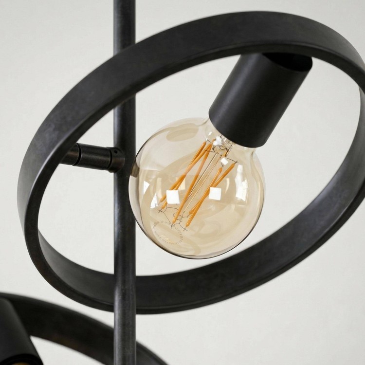 Das schwarze Metall zeigt eine leicht patinierte Oberfläche, die die Authentizität des Materials unterstreicht und die runden Linien dieser industriellen Deckenleuchte aus schwarzem Metall hervorhebt. Mit einer Höhe von etwa 35 cm und einem Durchmesser von 26 cm für den Hauptring findet die Deckenleuchte ganz natürlich ihren Platz in unterschiedlichen Wohnsituationen – sei es in einem modernen Wohnzimmer, in einem puristischen Eingangsbereich oder in einem Schlafzimmer mit behaglicher Atmosphäre. Die G95-Leuchtmittel (nicht enthalten), die im Inneren der beweglichen Ringe sichtbar sind, spenden ein warmes Licht, das die Reliefwirkung der Formen hervorhebt und ein feines Schattenspiel auf den umliegenden Flächen erzeugt.
