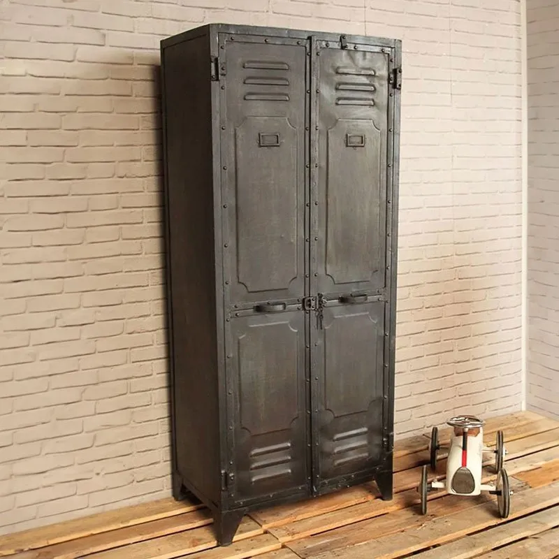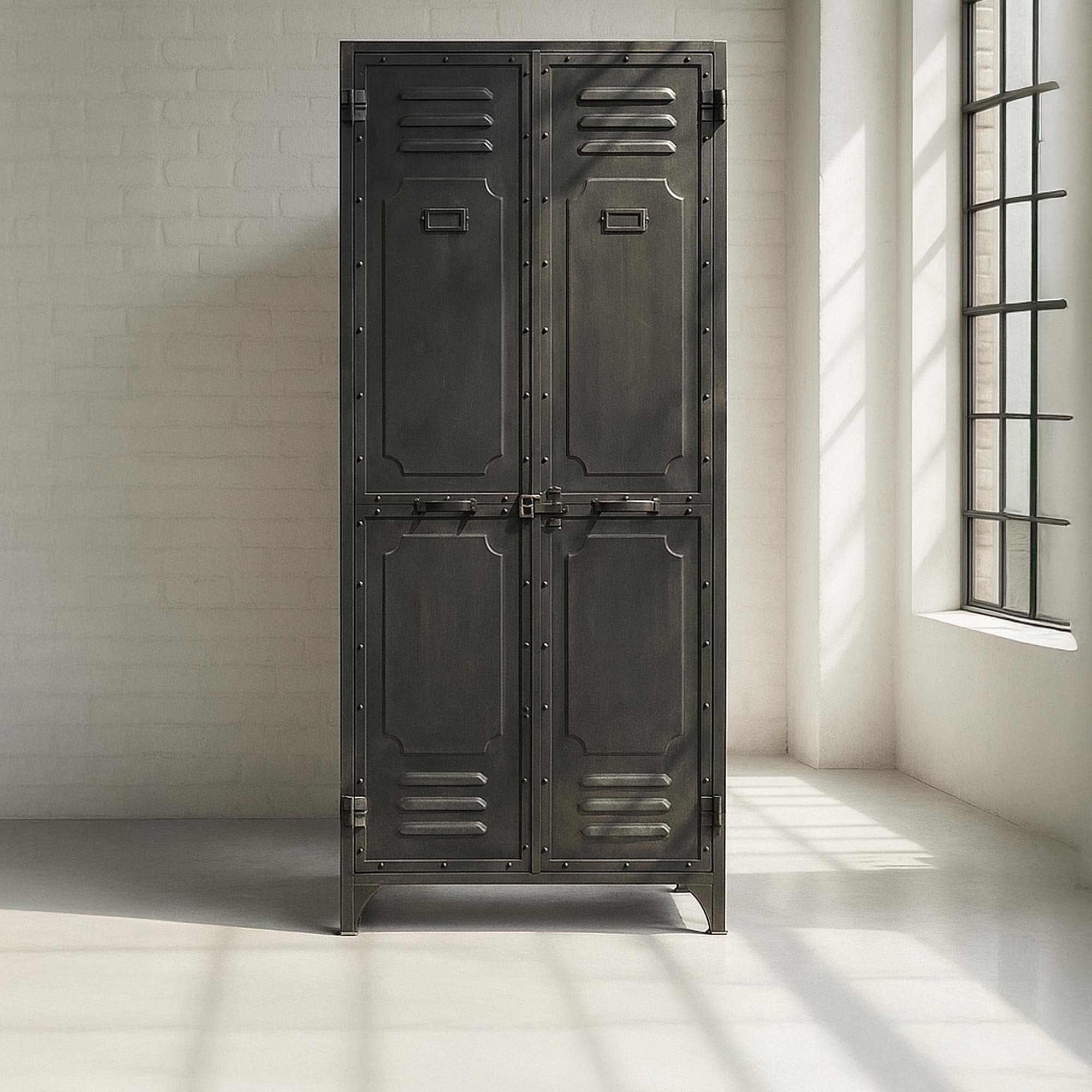 Das Besondere an diesem Garderobenschrank ist das Design der Türen. Man erkennt den Vintage-Stil der Spinde von früher, die unsere Großeltern noch gut kennen. Die Türen sind mit mehreren Schließpunkten ausgestattet und gewährleisten die Diskretion des Inhalts. Ein Etikettenhalter aus Metall ziert die Türen. Ein kleines Extra, um die Inspiration durch seine historische Vergangenheit zu verstärken. Oben an den Türen befinden sich zwei Riegel, und die Mitte kann mit einem Stift an einer Kette geschlossen werden. Wir schätzen auch den Karboneffekt des Metalls, eine schwarze Patina, die diesem Aufbewahrungsmöbel Authentizität verleiht und sich mit dem Rest Ihrer Möbel verschmelzen lässt.